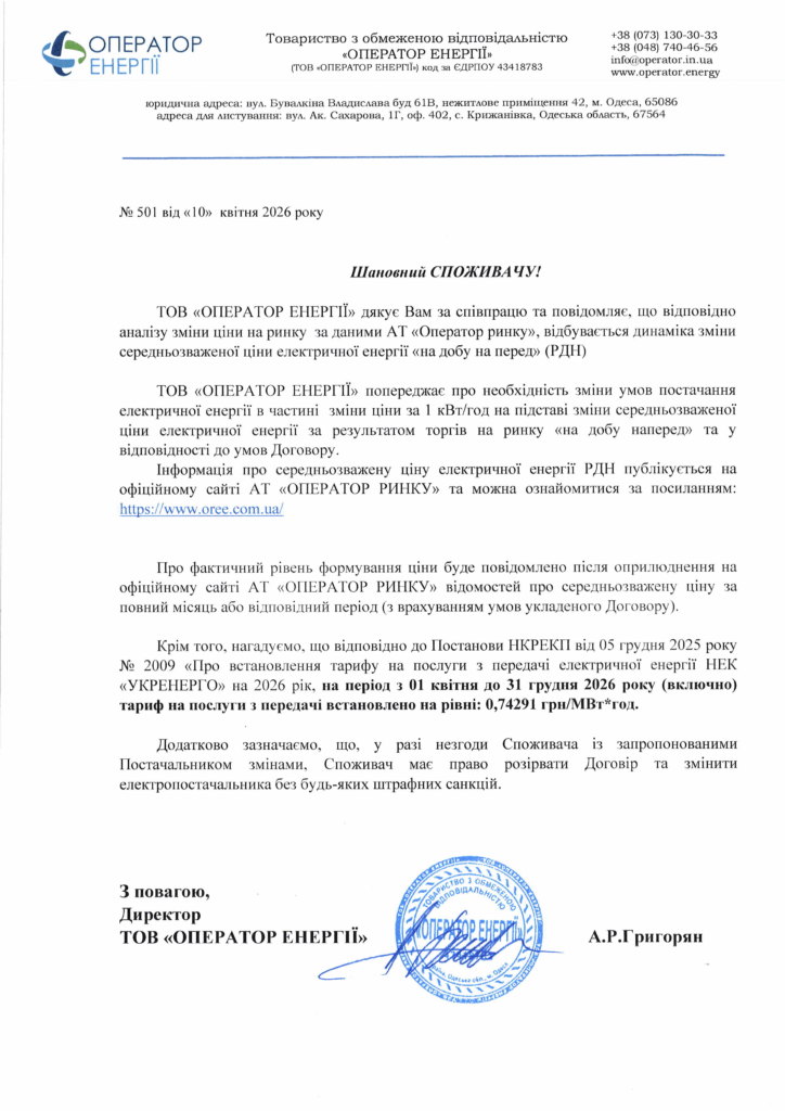Category: Що до зміни ціни на електричну енергіюBy operator09.04.2026Leave a comment Share this post Share on FacebookShare on Facebook Share on XShare on X Pin itShare on Pinterest Share on LinkedInShare on LinkedIn Author: operator https://operator.in.ua Post navigationПопереднійПопередній пост:Повідомлення про зміну умов постачання березень 2026Related postsПовідомлення про зміну умов постачання березень 202609.03.2026Повідомлення про зміну умов постачання лютий 202607.02.2026Повідомлення про зміну умов постачання січень 2026 та зміна юридичної адреси09.01.2026Повідомлення про зміну умов постачання грудень 202509.12.2025Щодо зміни ціни на електричну енергію у листопаді 202507.11.2025Щодо зміни ціни на електричну енергію у жовтні 202509.10.2025